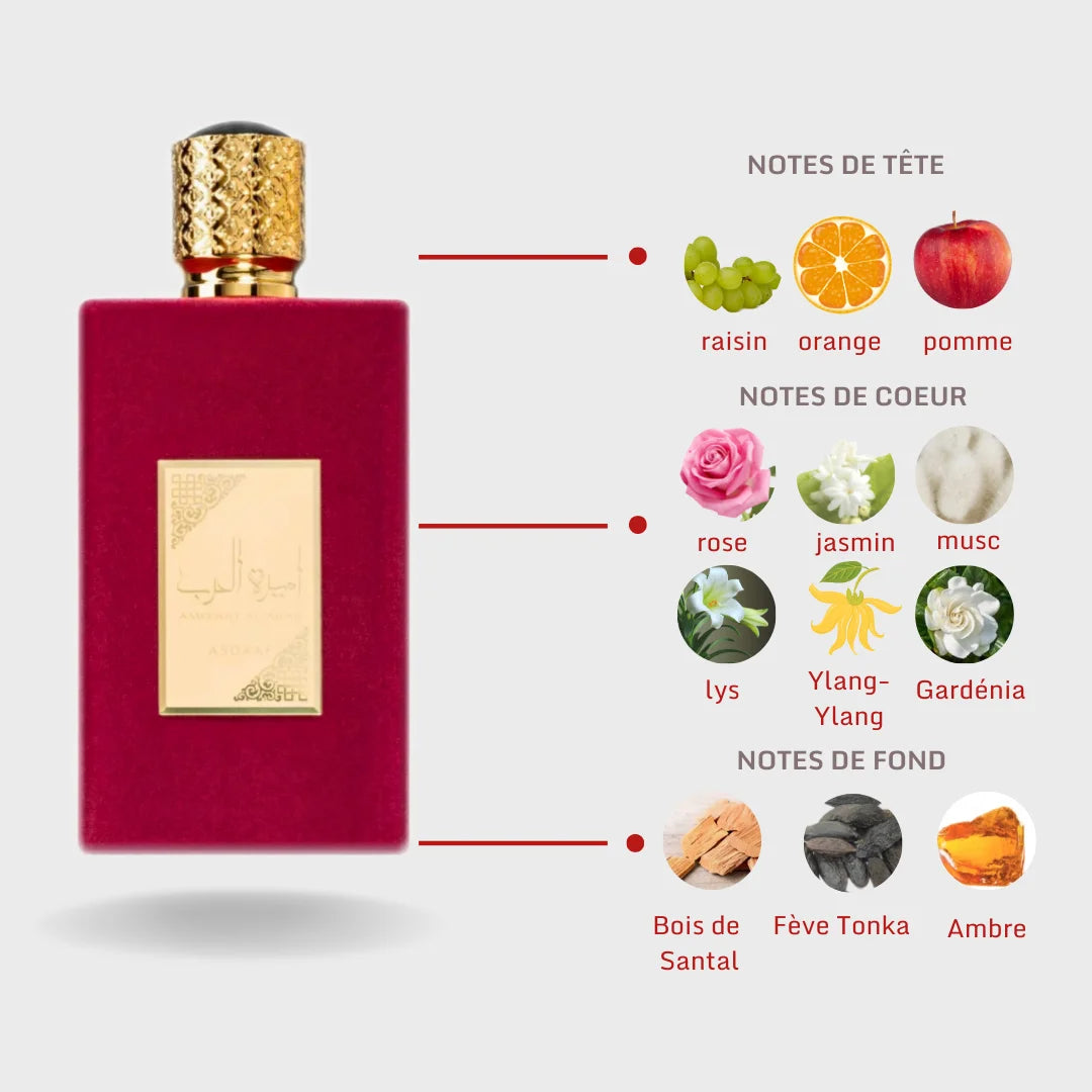 Ameerat Al Arab est une fragrance sophistiquée, façonnée pour celles qui veulent laisser une empreinte irrésistible. Dès les premières notes, le parfum dévoile un bouquet floral lumineux mêlé à des accents fruités délicats, créant une aura douce et séduisante.